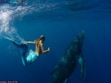 模特装扮成美人鱼与鲸共舞