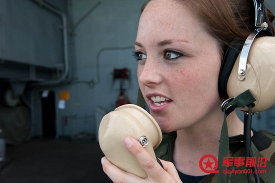 当地时间2011年9月23日,来自德克萨斯州路易斯维尔的航空机械兵飞行员Ashley Barnes正在播报航母上的相关事宜。